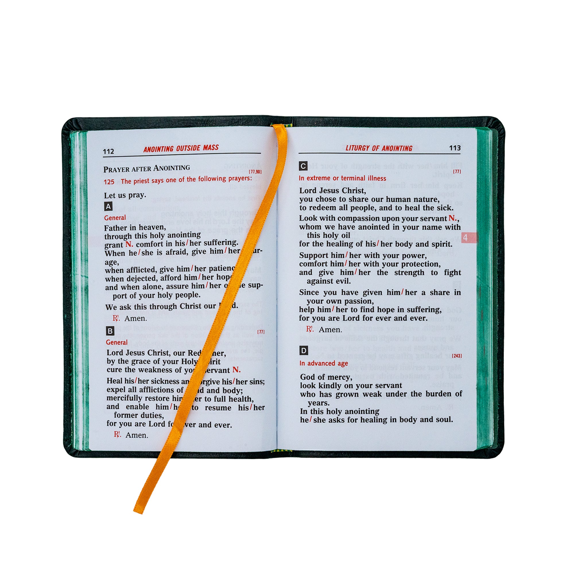 This is the official, revised edition of The Order of the Anointing of the Sick and of Their Pastoral Care, which includes all the enhanced features that celebrants have come to know and trust from Catholic Book Publishing: large, easy-to-read type, printed in two colors; a proven layout that respects functional page-turns, deluxe end-papers; a sturdy cover, and two satin ribbon markers to add an elegant finishing touch. Specially produced acid-neutral cream paper from established, quality mills ensures a high level of opacity and consistency of the highest degree. The pocket size edition also features a handy edge-marking index. 336 pages. Size 4 x 6 1/4.